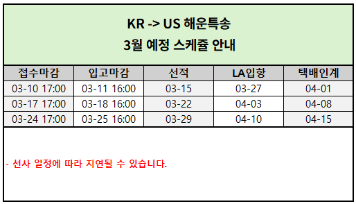 - 운송일정(스케쥴): 매주 3항차 발송(7일이내 배송완료)